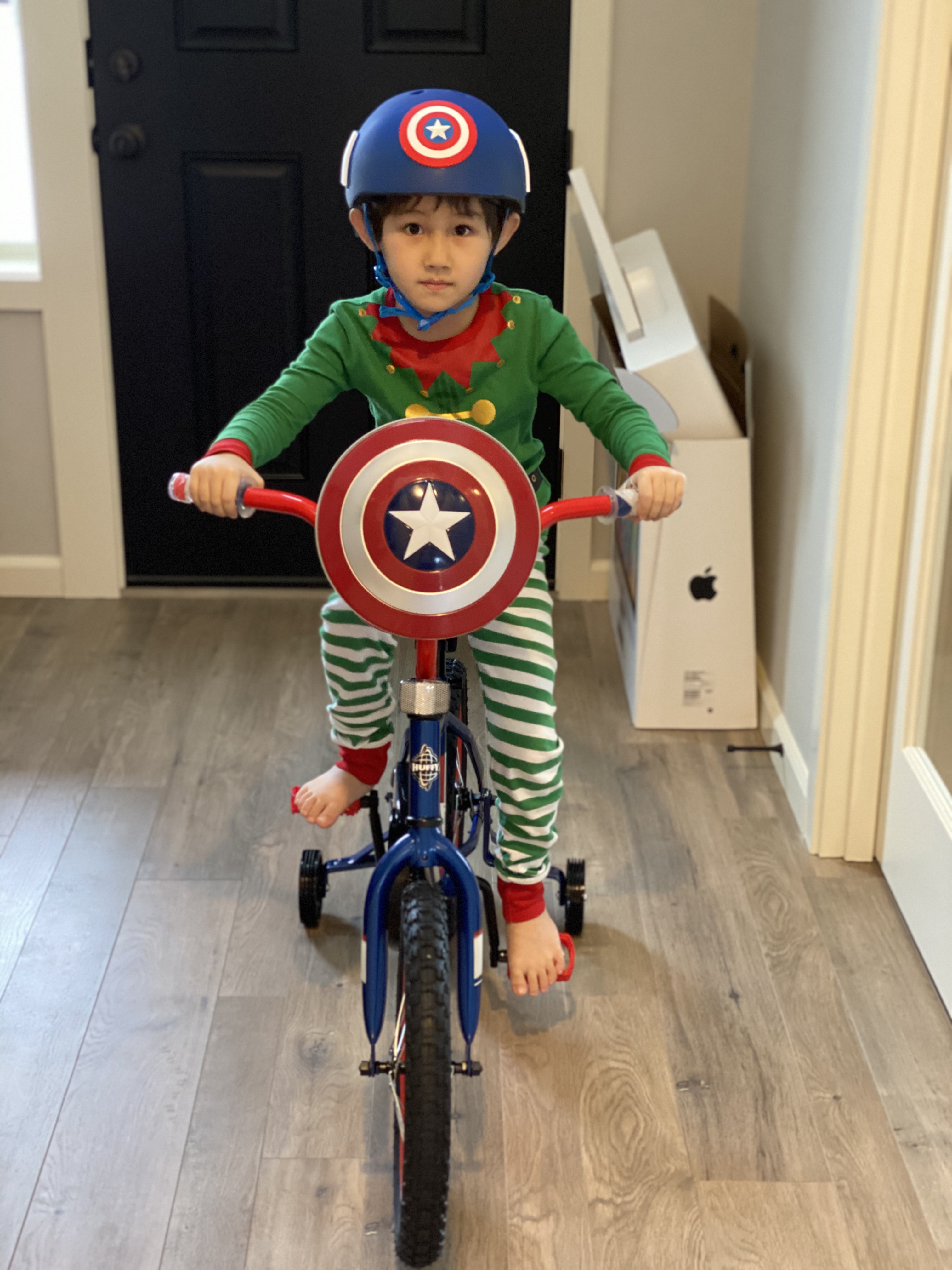 산타 할아버지 선물 시승식 중. 캡틴 아메리카 헬맷까지 깔맞춤 하느라 이 애미가 인터넷을 얼마나 싸돌아댕겼는지 알랑가 모르겠네.