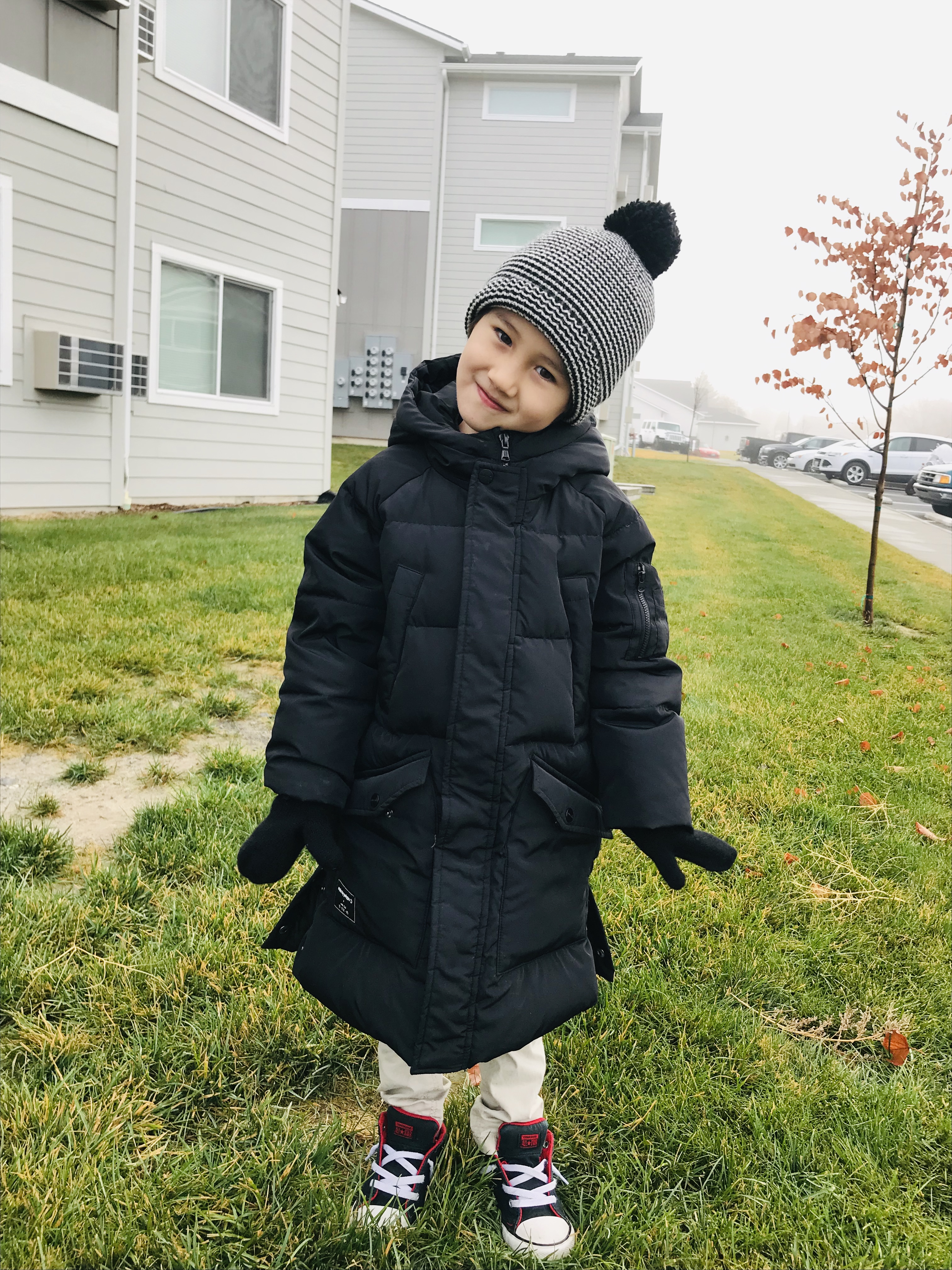 11월인데 이미 한겨울 날씨! 아침마다 차 앞 뒷 유리에 낀 성애 제거하느라 식겁합니다. 12월초에 와플이 친구의 생일 파티가 있는데 오너먼트에 넣을 사진이 필요하다고 한장 찍어서 보내 달래서 아침 등교 전에 아파트 앞 잔디밭에서 "키즈 카페~" 시켰는데 A급 사진 나옴요. 울 애들은 치즈~ 하면 예쁜 표정이 안 나오는데 키즈 카페~를 시키면 한국에서 너무 재미있었던 키즈카페를 가고 싶은 마음에 예쁜 표정으로 키즈 카페~를 외치더라고요. 그놈의 키즈 카페 1년 반째 외치고 있는데 언제 또 데려갈 수 있을지 모르겠지만...