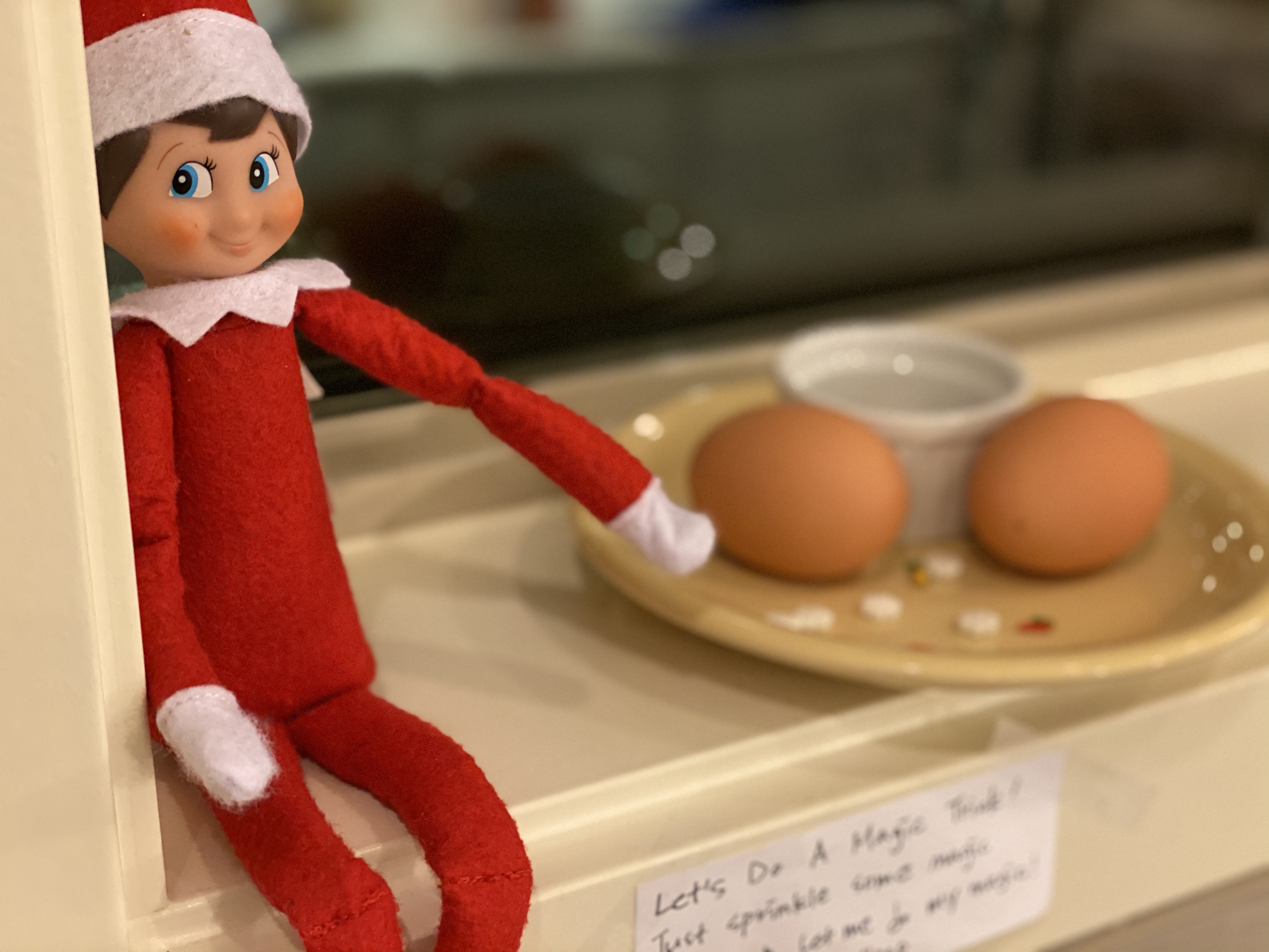 계란 두개를 올려 놓고 캔디 스프링클을 뿌려두고 하룻밤 자면 엘프의 매직으로 이 계란이 어떻게 되는지 보자는 설정. 그래서 와플이와 제제가 스프링클을 뿌려두고 하룻밤을 기다렸죠~