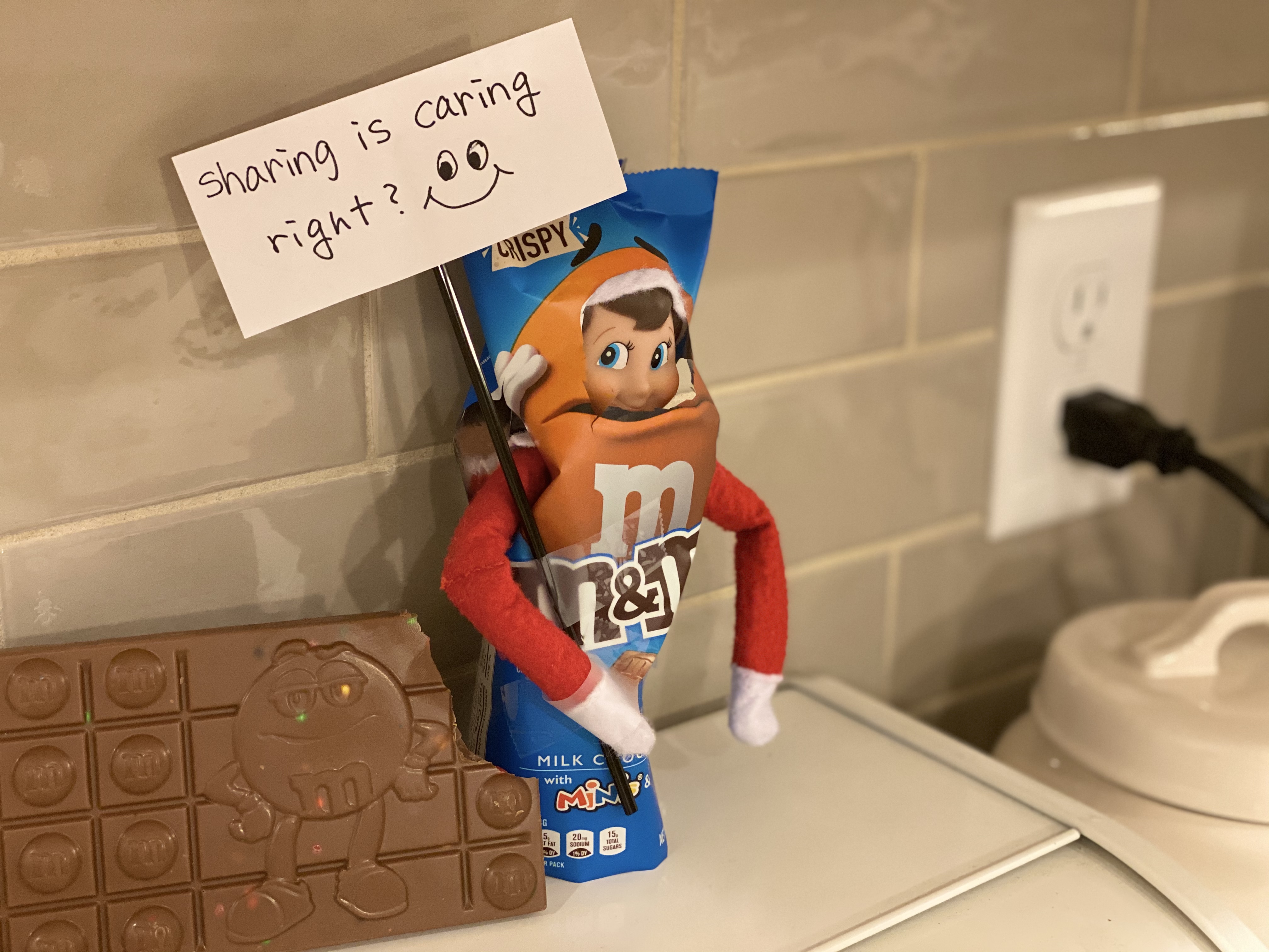 엘프 놀이 할려고 산 엠엔엠 초콜렛을 먼저 와플이가 발견해서 다음날 학교 갔다와서 주겠다고 약속하고 그날밤 열심히 초콜렛 봉투 오려서 엘프 담고, 초콜렛도 한 조각 먹은 설정으로 놔두었는데...