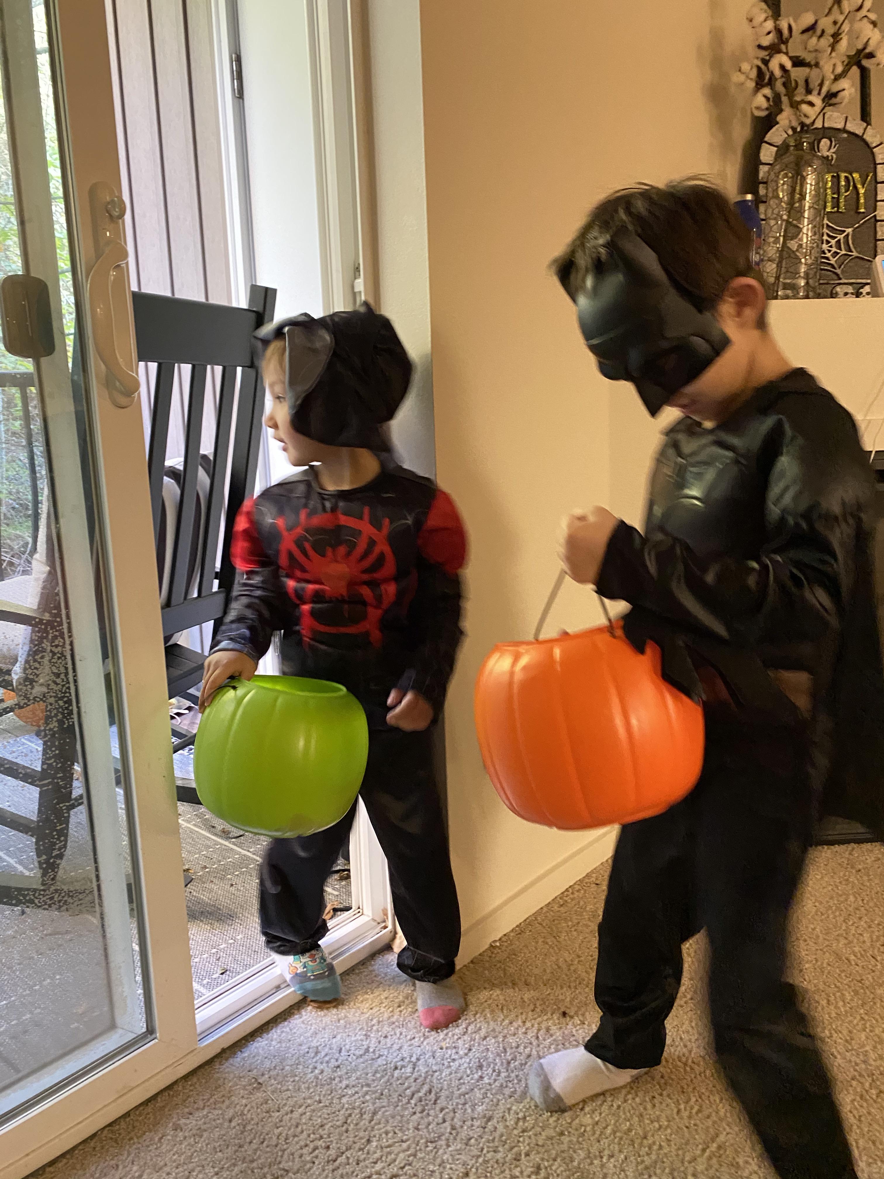 그리고 다음날 할로윈이 되었습니다. 제가 살고 있는 아파트 오피스에서 사탕을 나눠주는 trick or treat 행사를 한다고 안내문이 왔지만 전 아이들에게 이번해는 trick or treat 대신에 캔디 헌팅을 할거라고 얘기 해 두고, 미리 사탕을 여기 저기 숨겨 두었어요. 집에서 하는 엄마 아빠 주최의 행사에 꼭 코스튬이 필요가 있을까?하며 작년 코스튬 재탕을 계획했으나, 창고 어딘가에 있는 코스튬을 찾을 엄두가 나지 않아, 할로윈 이틀전에 급구매한 취향 무시 코스튬. ㅎㅎㅎ 왜때문인지 우리 와플이랑 제제는 지구를 구하는데는 관심이 없습니다. 늘 정체불명의 괴생물 집합체인 포켓몬 같은거나 좋아하고 말이죠.
