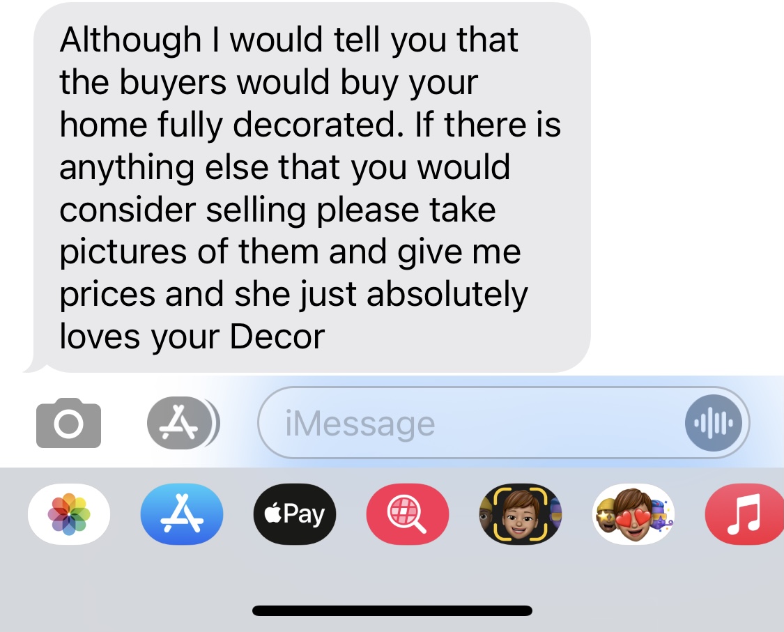 그리고 나선 바이어 리얼터로 부터 문자가 오더니 바이어가 저희집 인테리어 데코 된 그 상태 그대로 다 사고 싶어 하니까 혹시라도 팔고 싶은게 있다면 사진과 가격을 보내 달라고 하더라고요.