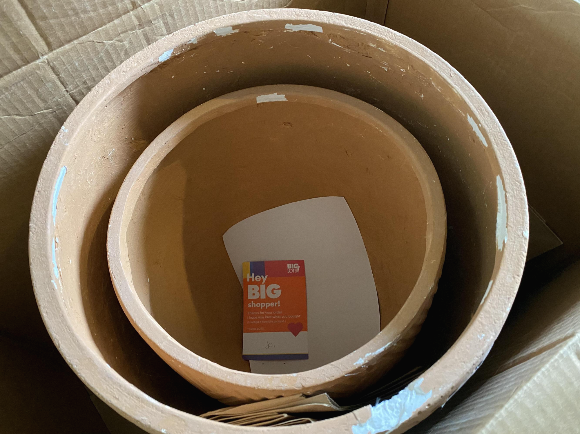 제품 두개 포장 상태가 좋지 않아서 화분 두개 다 테두리 부분에 손상이 되었다, 하지만 작은 화분은 비록 약간의 손상이 있지만 내가 사용하도록 하고, 큰 화분은 테두리의 손상이 좀 크니까 반품 하도록 하겠다