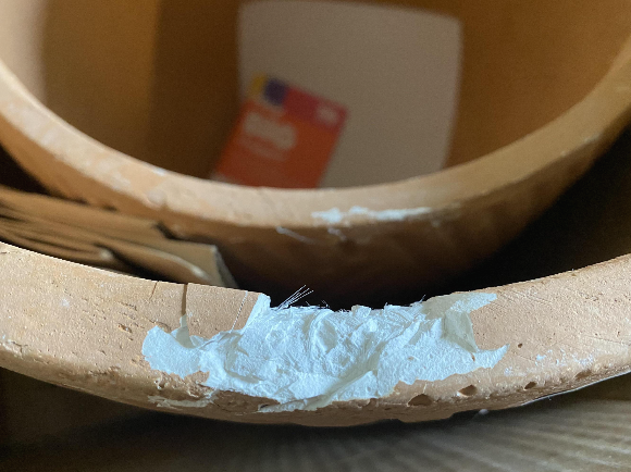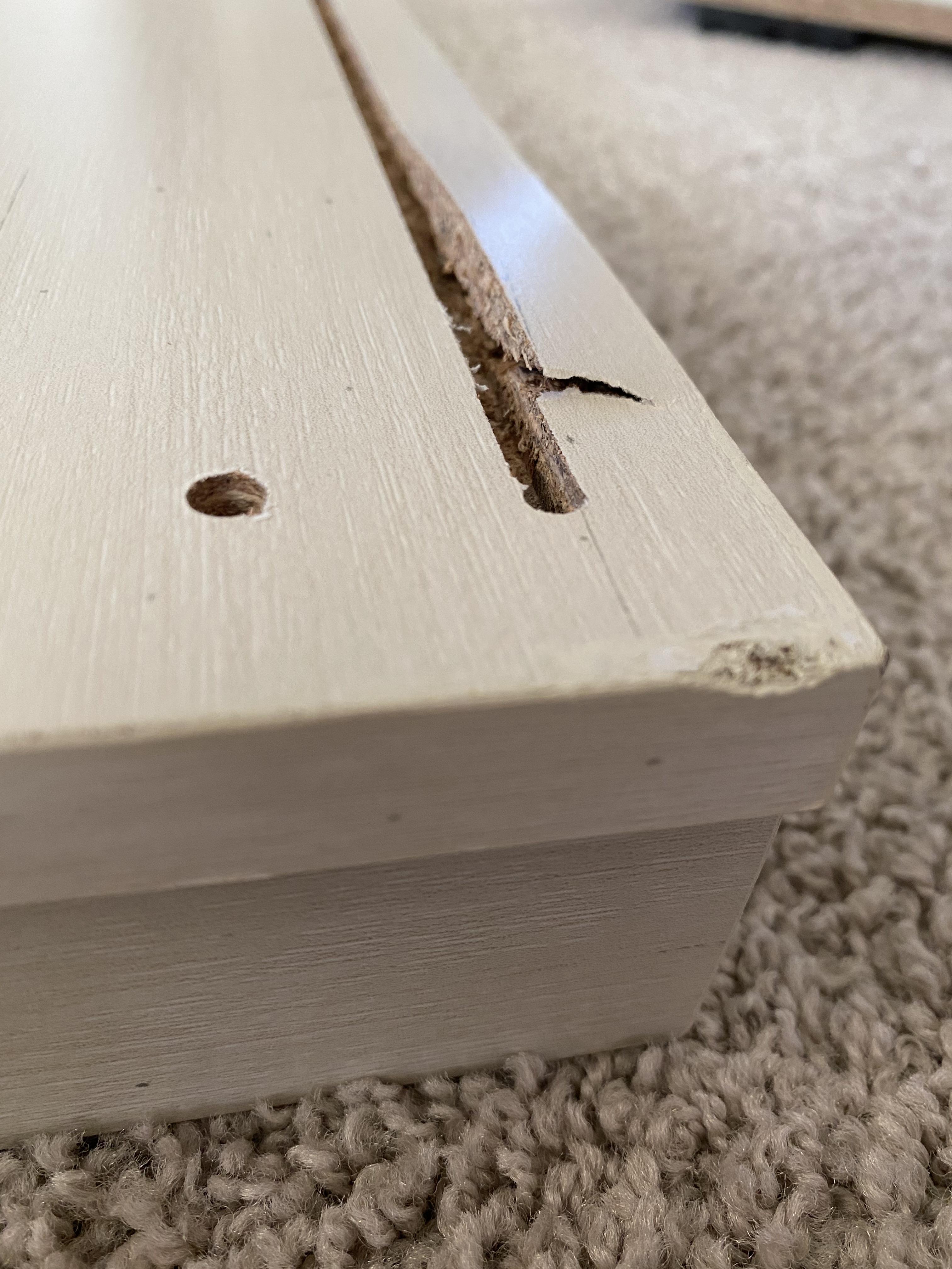 아무튼 제품을 구입하고 남편이 조립을 해 줬는데.... 와플이 아부지도 뼛속까지 미국인인지라.. 어지간한 흠집과 하자에 동요하지 않는 멘탈을 가지고 있지요. 그래서 조립 과정 중 제품이 손상 되었다는 것을 발견했음에도 저에게 고지의 의무를 어기고 그냥 조립 직진 하더니 다 완성 한 후 지나가는 말로 "그런데 말이야... 여기 제품 손상이 있었어" 하면서 보여 주더라고요.