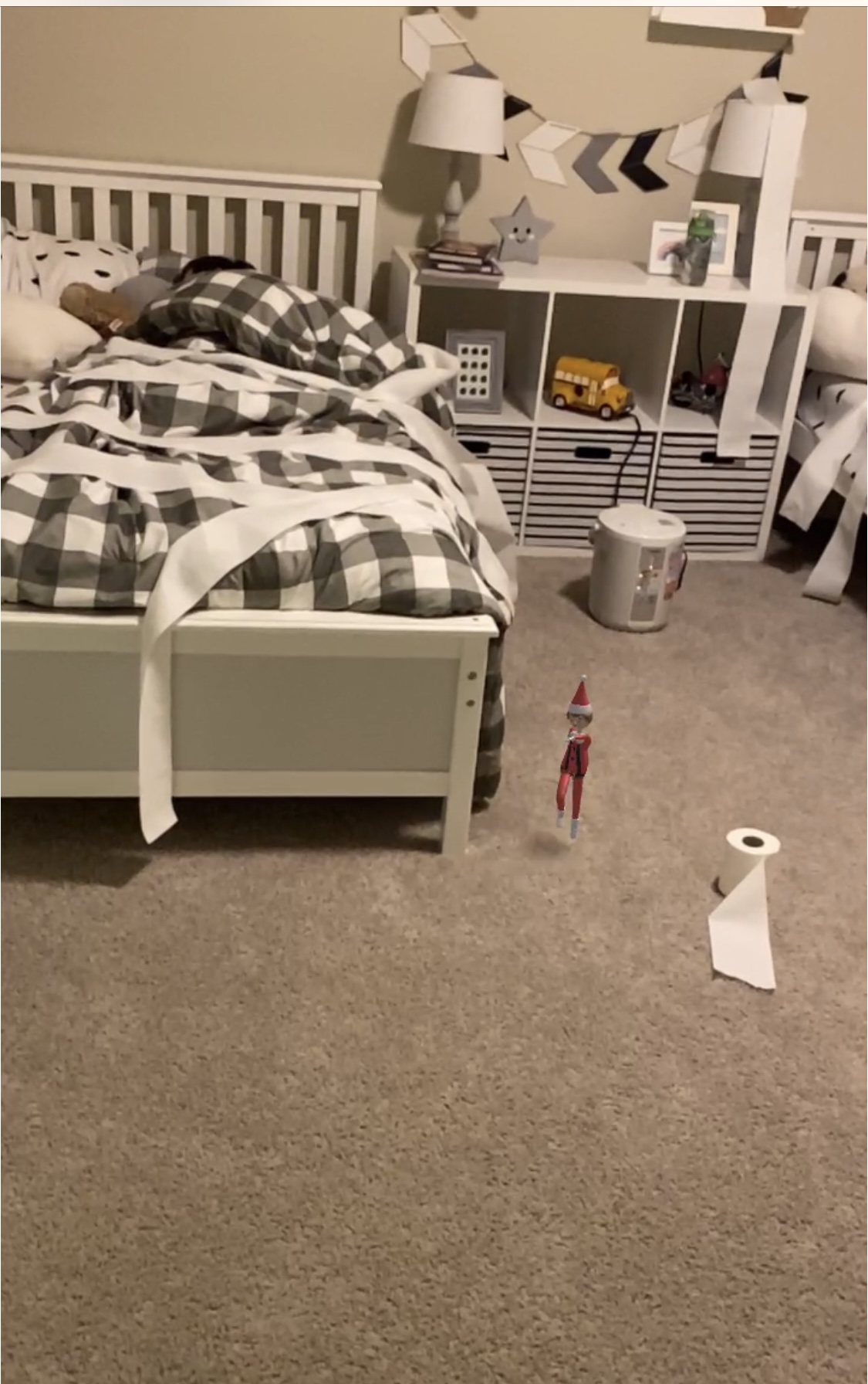 세계 각국의 동지 엄마들이 알려 준 '엘프캠' 이라는 어플로 엘프가 돌아다니는 동영상을 촬영했어요. 그래서 휴지를 여기저기 풀어 놓고 방방 뛰어다니며 대폭소하는 영상을 찍은 후에 다음날 아이들에게 보여 줬답니다.