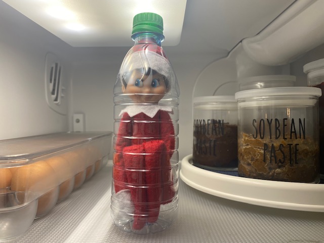 물병 뒤를 가르고 그 사이에 엘프를 집어 넣었어요. 엘프를 만질 수 없는 룰이 있으니 아이들은 물병 뒤를 볼 수가 없고 엘프가 어떻게 저 안에 들어가 있는지 미스테리... 그러니 엘프 매직을 믿을 수 밖에요. 원래는 코카콜라 병으로 해서 빨간색의 코카콜라 라벨과 엘프 옷이 매치 되게 하면 더 예쁘고 보기 좋던데 아쉽게도 코카콜라 페트병이 없었어요.