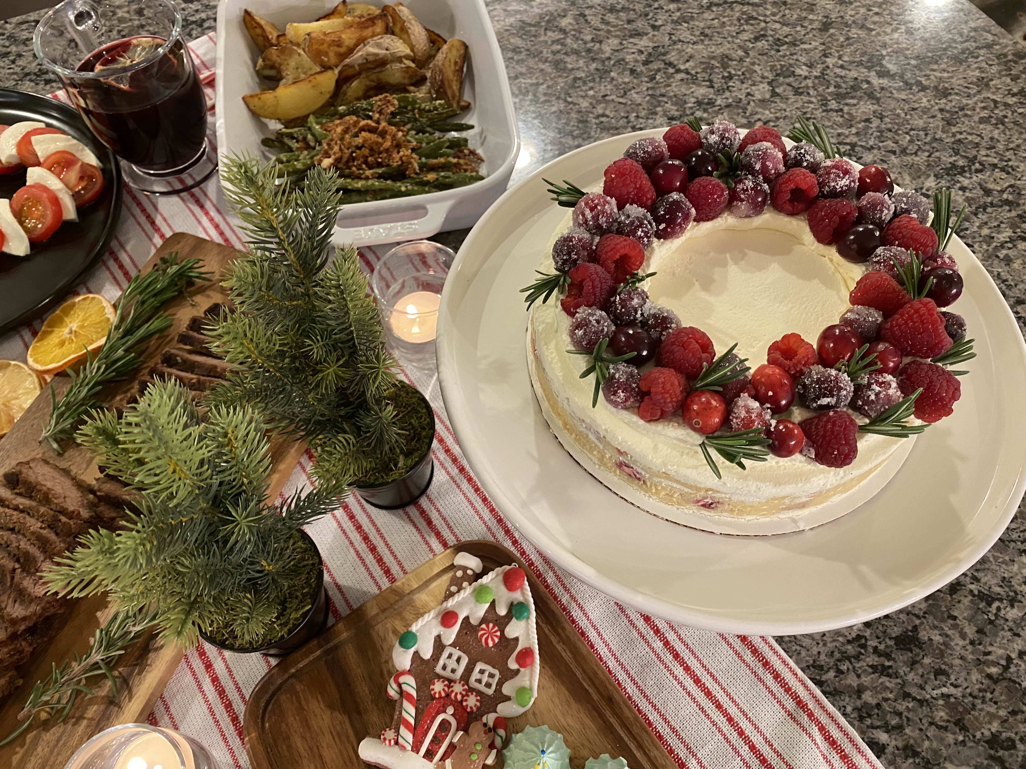 크리스마스니까 크리스마스 리스 느낌이 나도록 크랜베리로 만든 크랜베리 리스 케이크