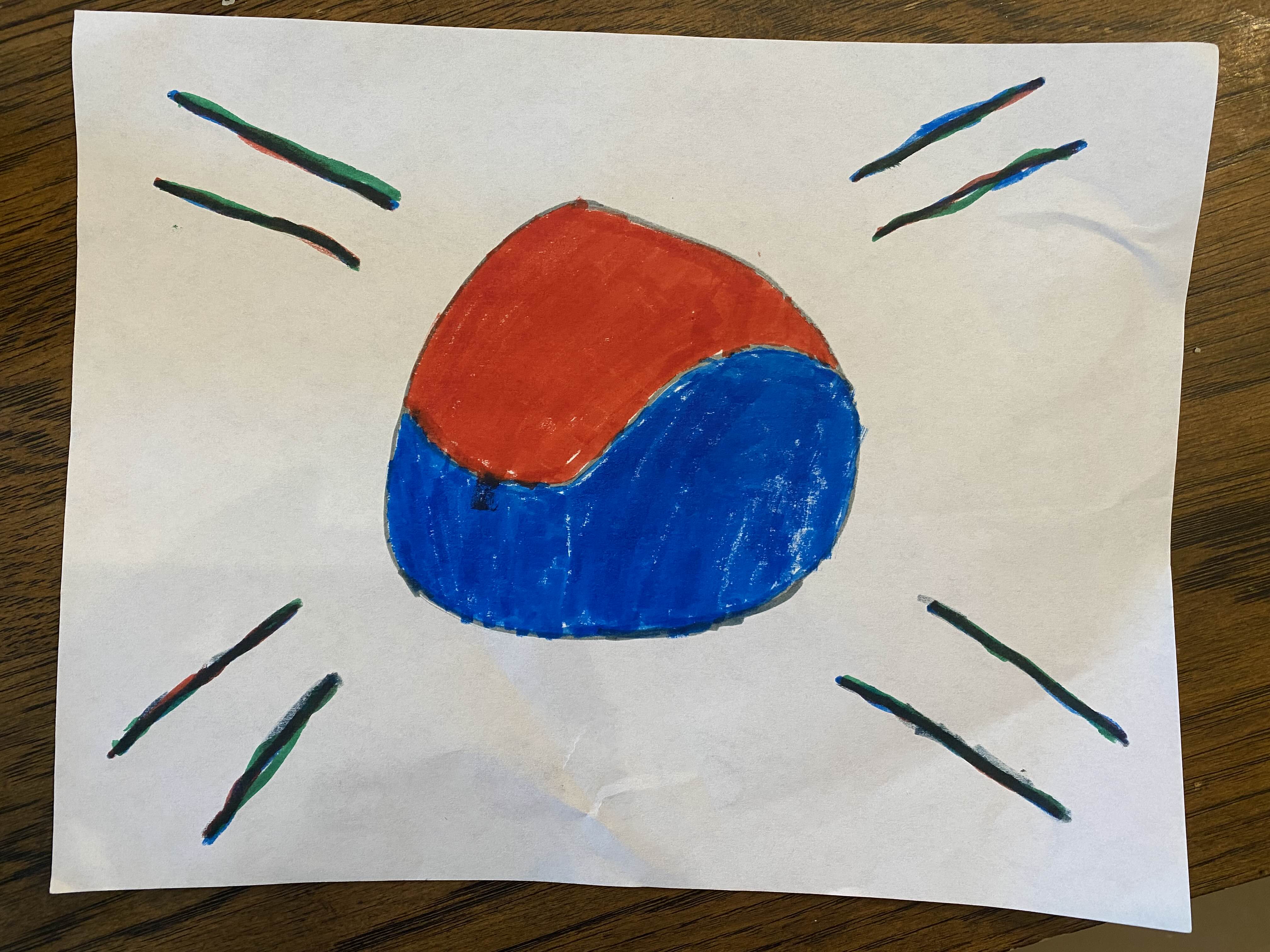 완벽한 태극기는 아니지만 미국 살면서 태극기 볼 기회가 거의 없는데 이 정도까지 그린 것이 저는 대견합니다.