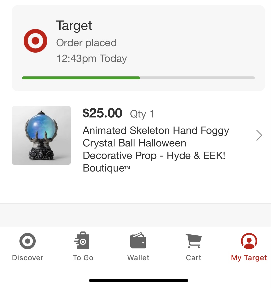 그... 제가 그렇게나 애타게 찾던 타겟의 마녀 구슬볼 기억하시나요? 타겟앱에 아침 점심 저녁 문안 인사 드리는 기분으로 찾아 뵈었더니 어느날 드디어 "옛다!! 재고!!! " 하며 in stock 메세지가 뜨지 뭐예요. 숨도 안쉬고 장바구니 담기와 결제 버튼을 눌렀습니다.