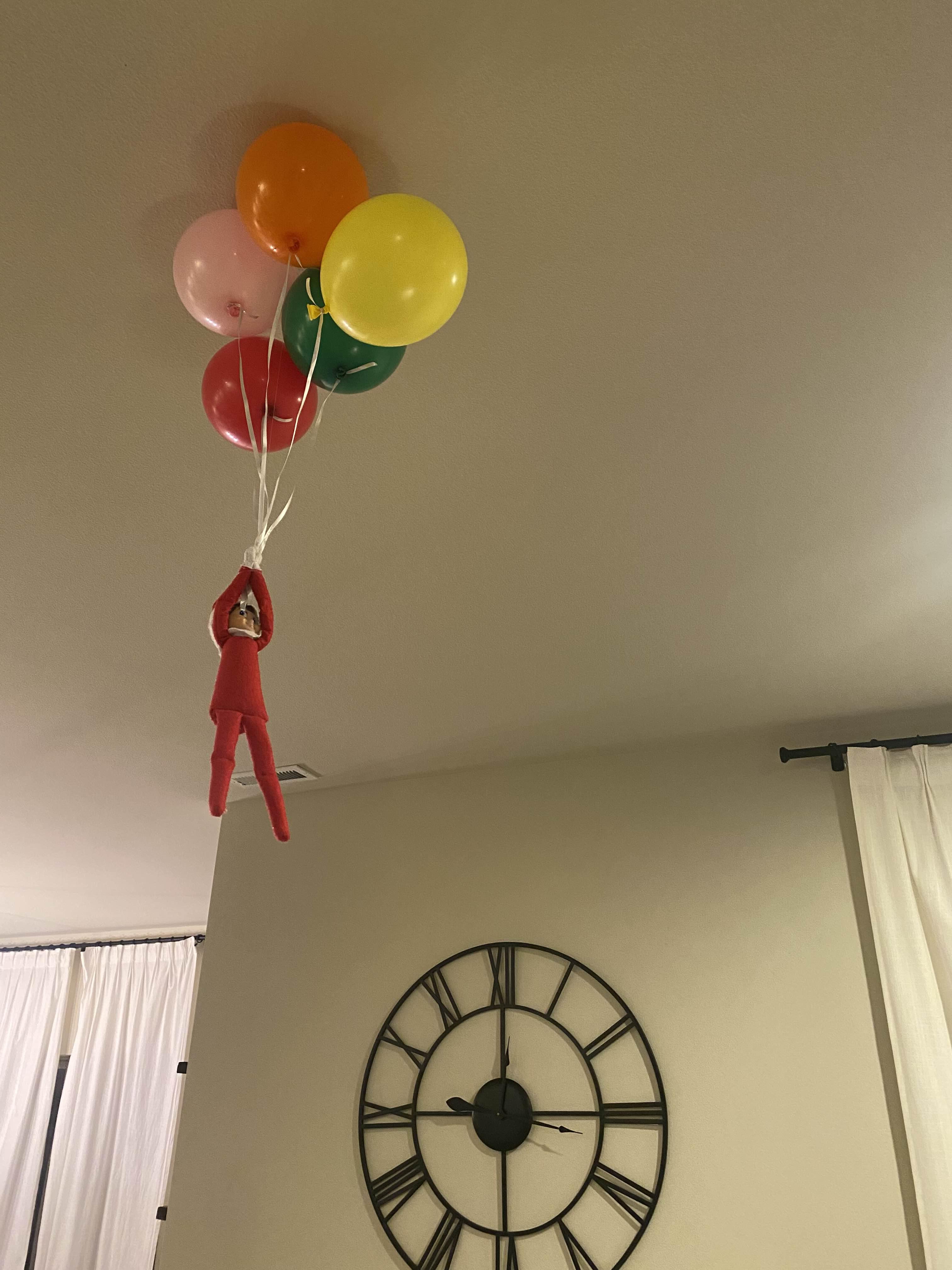 이건 헬륨 풍선이 아니고 일반 풍선이고 테이프로 천정에 붙였어요. 그리고 엘프는 낚시줄로 매달아서 천정에 핀을 꼽고 거기에 매달리도록 한 다음에 풍선줄을 잡게 만들어 마치 풍선에 매달린 것처럼 보이게 만들었어요. 벽시계의 시간을 보니 밤 12시 17분