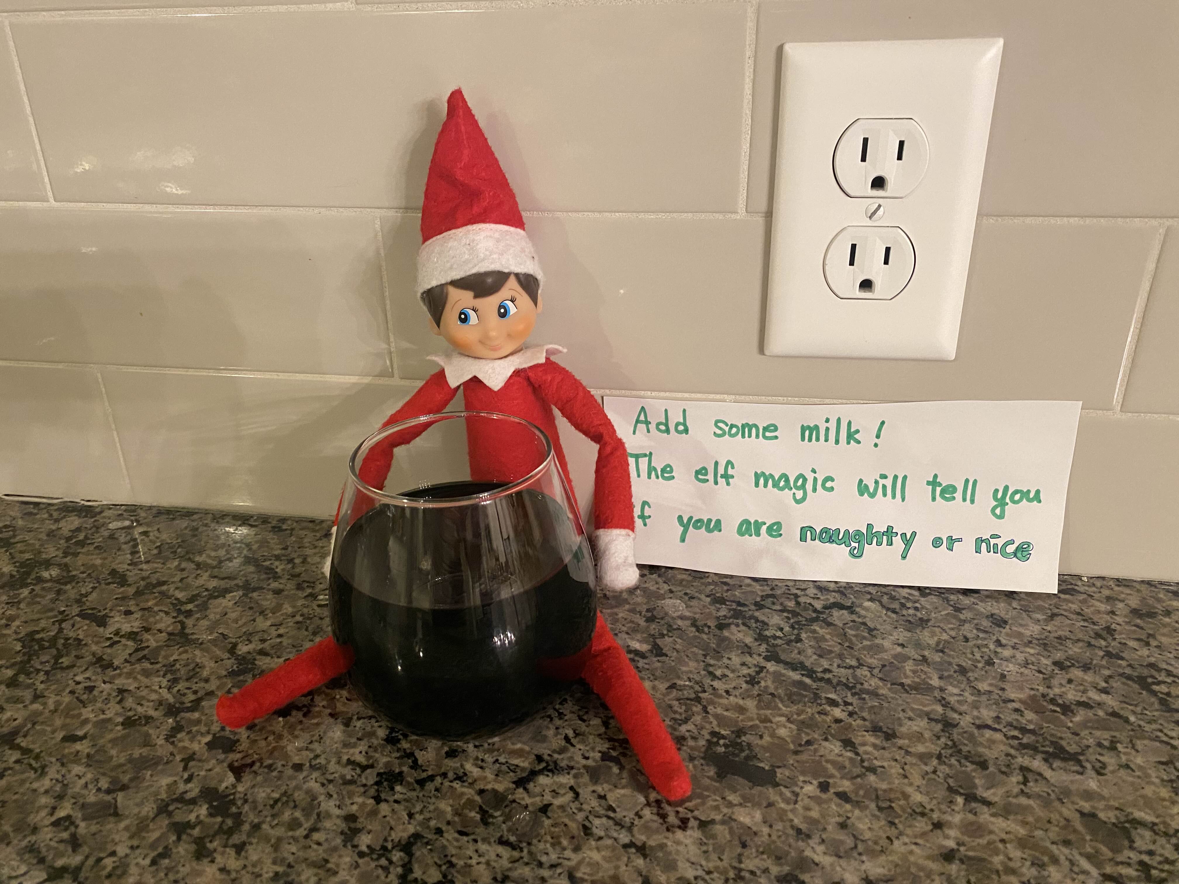 드디어 12월 23일 엘프의 마지막 놀이!!!! 검은 액체가 가득 담긴 컵에 우유를 부으면 아이들이 착하게 지냈는지 말썽 부리며 지냈는지 알려 준다는 엘프 매직