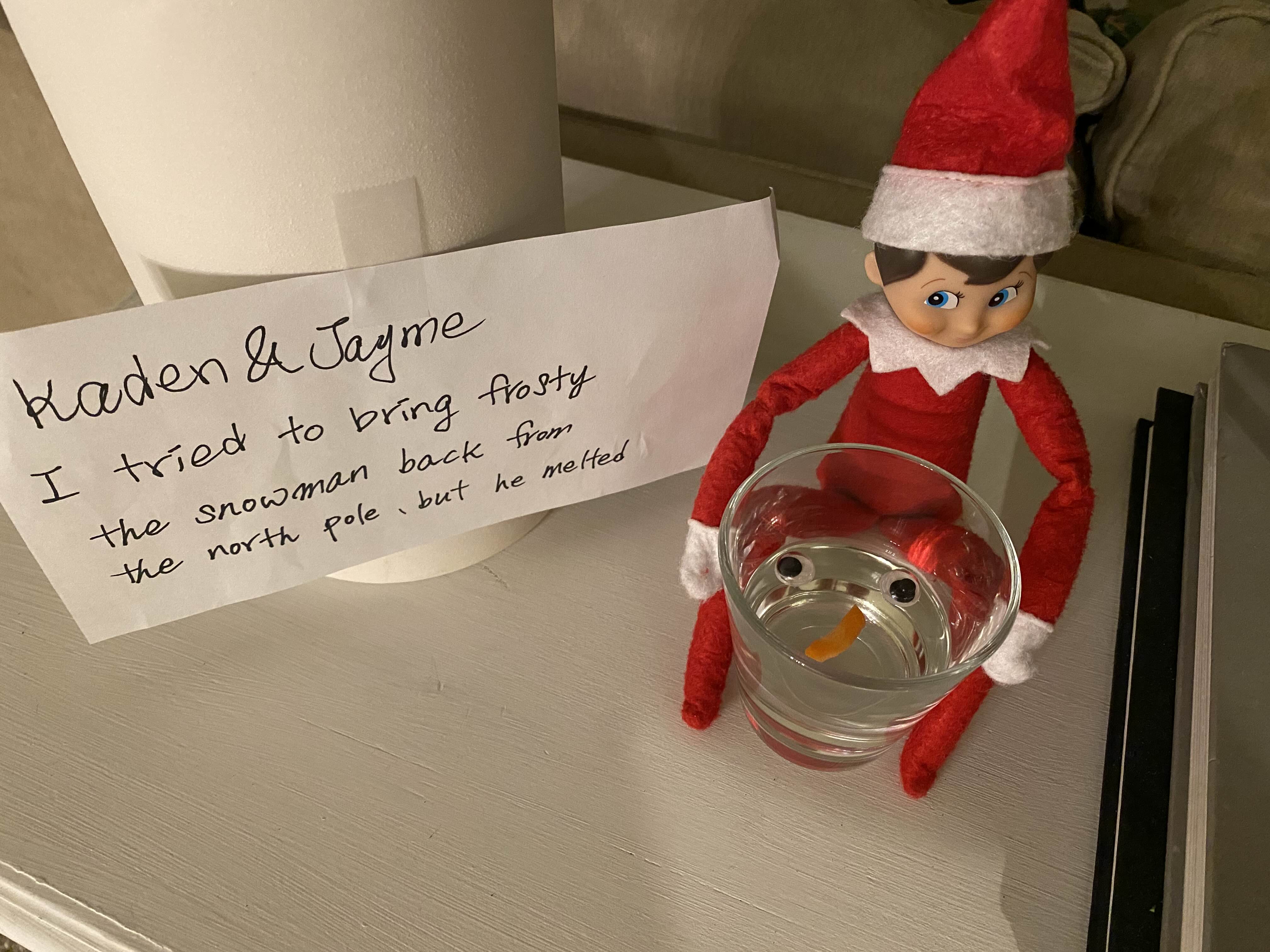 밤 사이 북극으로 간 엘프가 아이들을 위해 눈사람을 데려 왔지만 녹아 버려서 물이 되어 버리고 눈과 당근 코만 둥둥 떠 있어요.