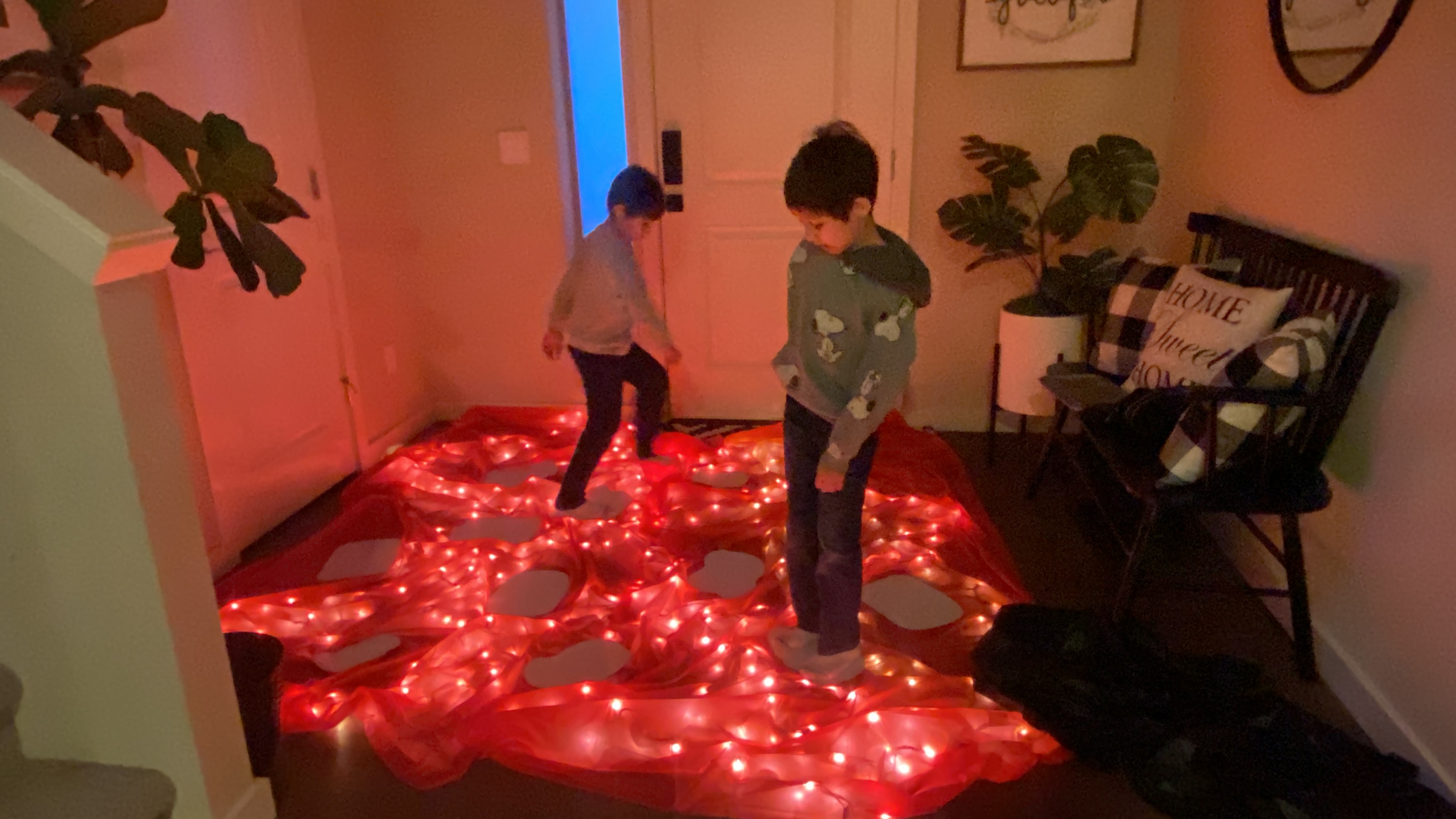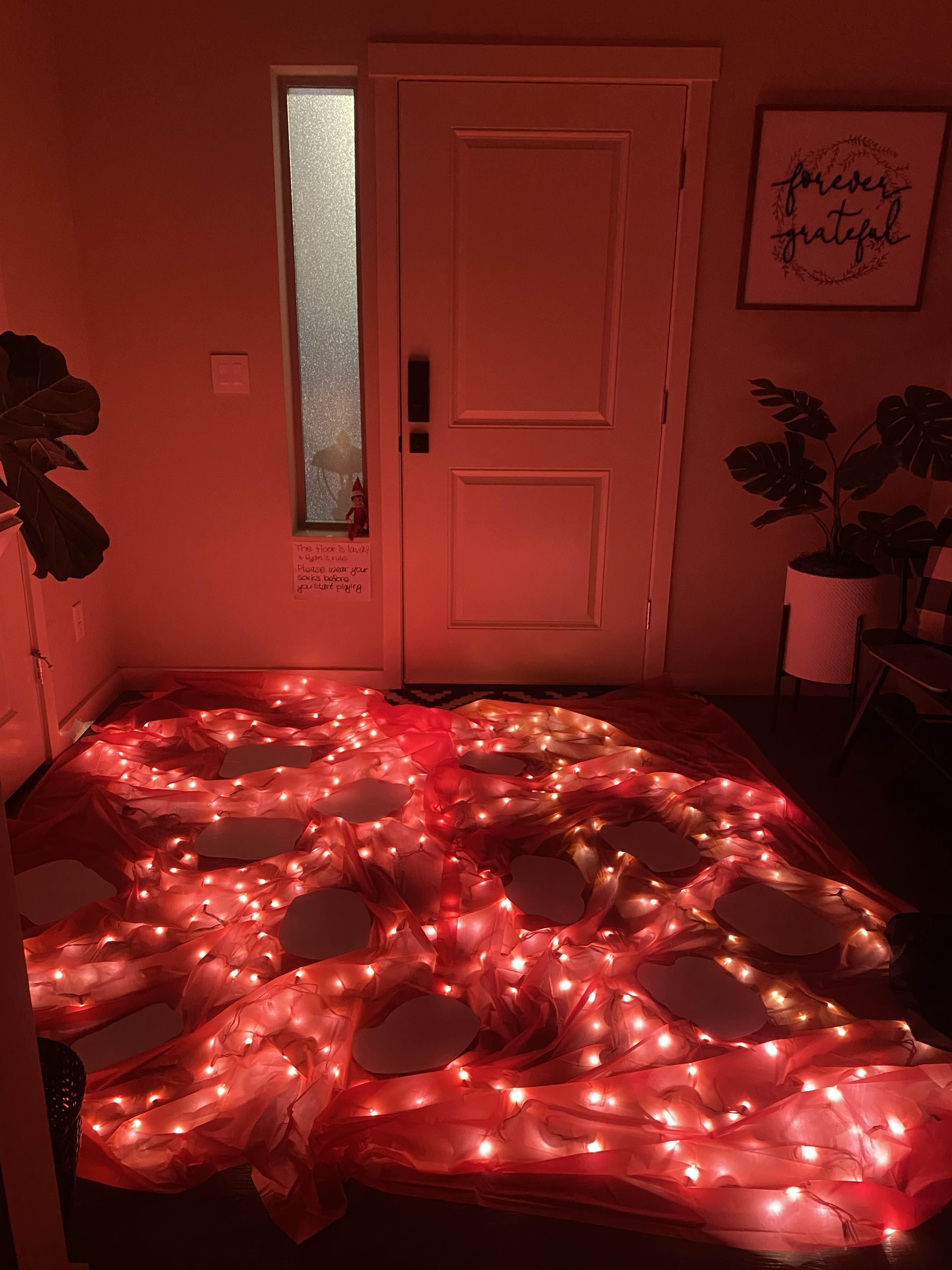 이건 미국의 유명한 쇼 프로그램 중 하나인 the floor is lava 라는 것에 아이디어를 얻어 바닥에 용암이 흐르고 있어 디딤돌만 밟아야 하는건데요, 물론 이것도 줍줍한 아이디어 입니다. 크리스마스 라이트를 바닥에 깔고, 그 위에 빨간색의 일회용 파티 식탁보로 덮어준 뒤에 종이로 디딤돌을 만들어 라이트를 밟지 않도록 올려 주는 거예요. 제가 한번 시험삼아 해 봤는데 맨발로 했더니 종이가 발에 들러붙고 난리~ 그래서 친절히 엘프의 게임 룰로 "양말 신기"를 추가했죠.