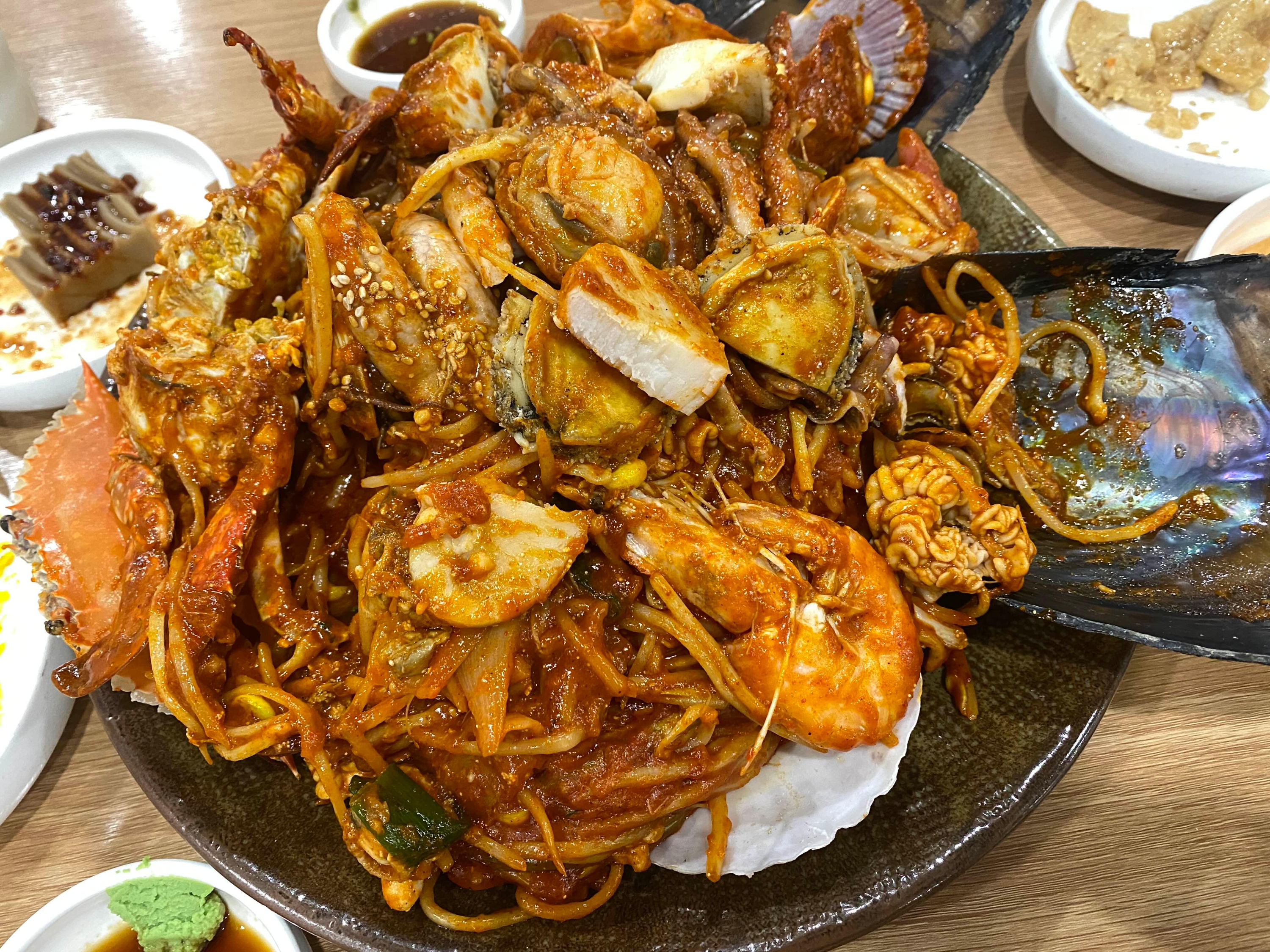 친구와 두명이서 먹었는데 첨에는 이렇게나 많은 양을 다 먹을 수 있을까 했지만... 일단 친구야 친구야!!! 아직도 넌 나에 대한 믿음이 없는게 큰 문제야!!! 그리고 친구야 친구야! 해물은 껍데기가 반이야. 또 친구야 친구야! 산처럼 쌓인 해물 아래에는 콩나물 산이 숨어 있단다!!!
