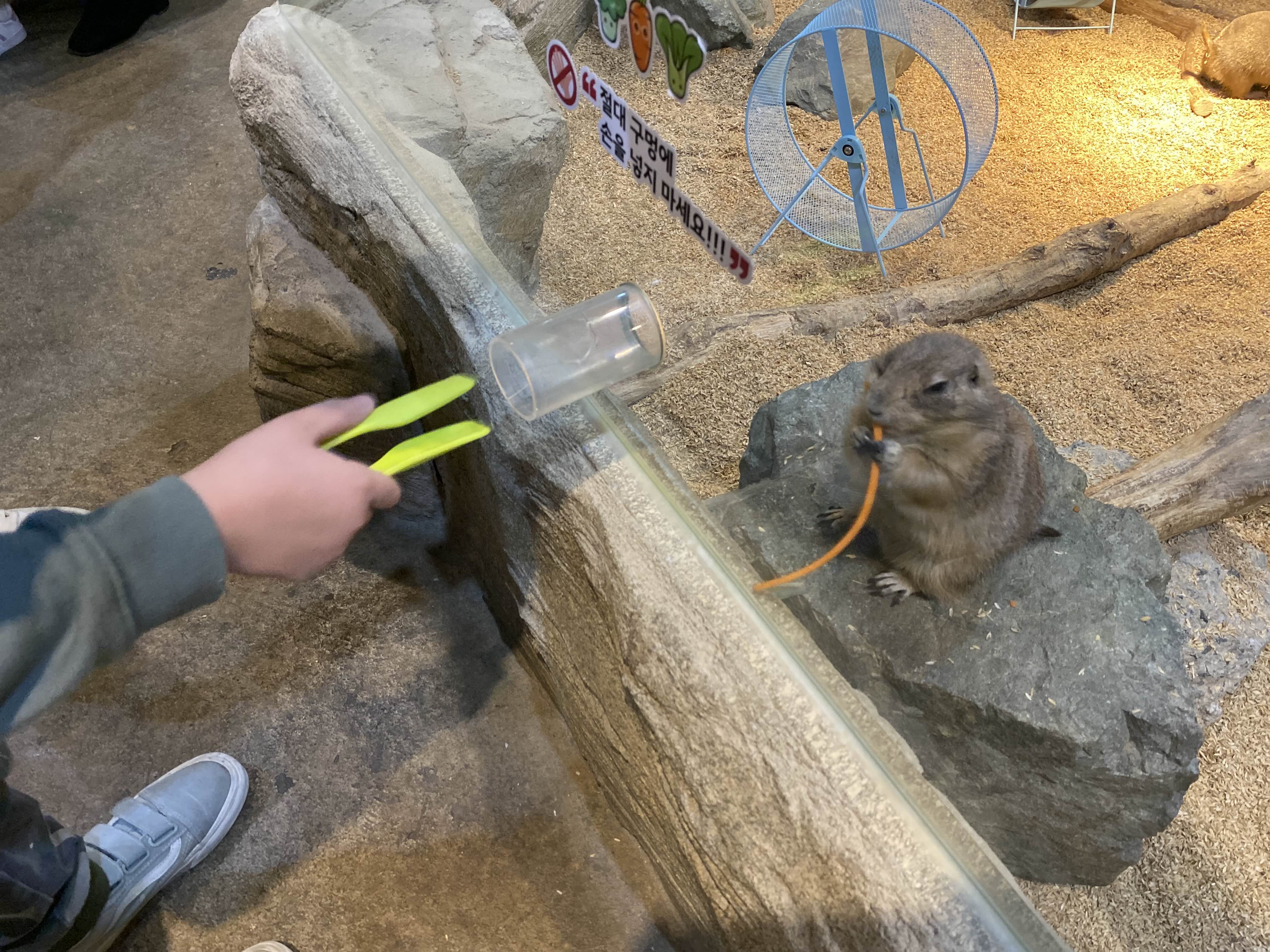 동물원에 입장하면 동물 먹이를 살 수 있고, 작은 플라스틱 장바구니에 야채와 당근 스틱등 몇가지 동물 먹이를 담아줘요. 손 소독을 하고 집게로 집어서 동물들에게 먹이를 줄 수 있어요. 동물들이 좋아하는 먹이에 대한 안내가 각 사육지 유리창에 표시되어 있어서 그 안내에 따라 먹이를 주면 되더라고요.