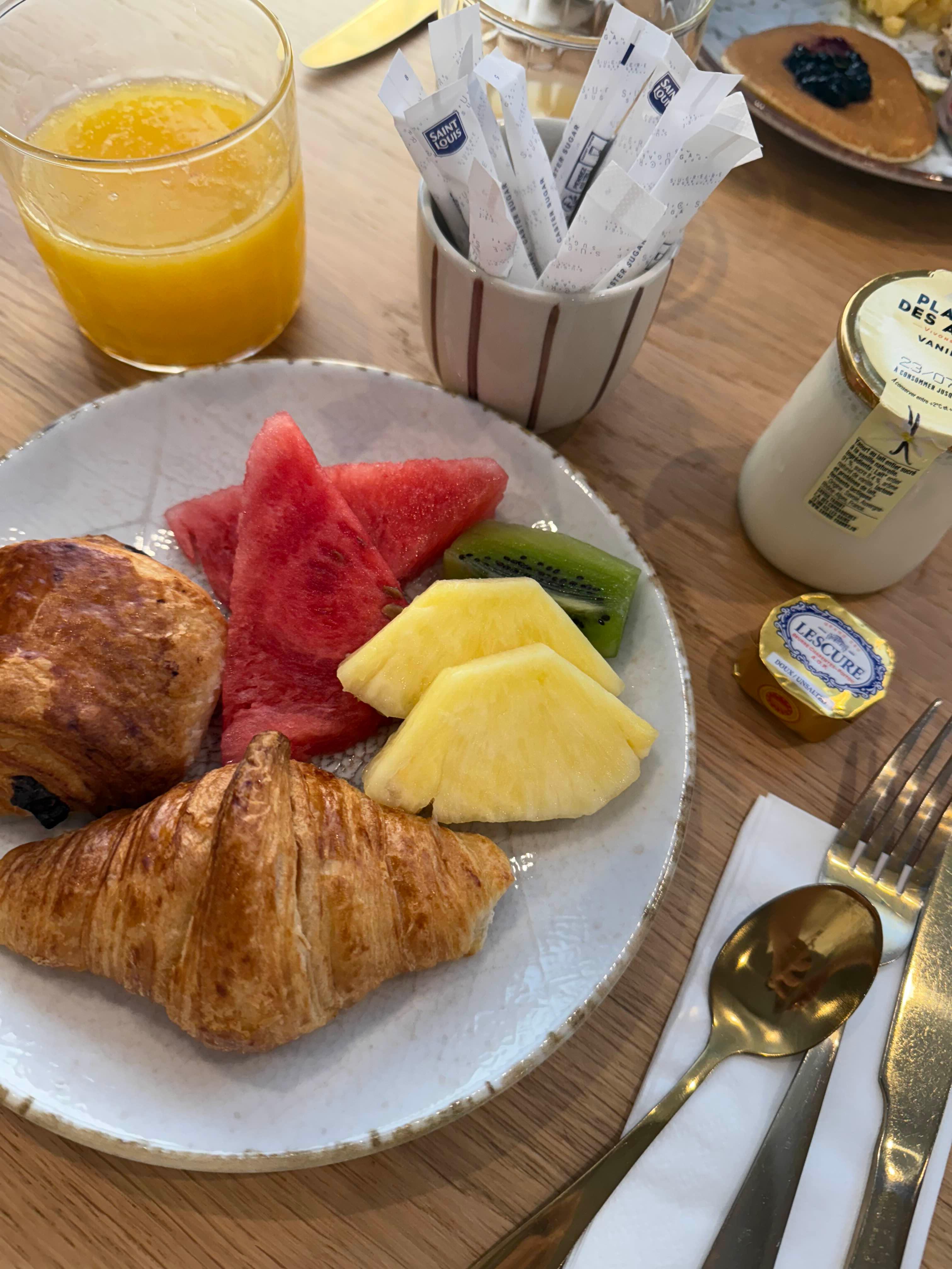 갓 짜낸 신선한 오렌지 주스와 과일, 그리고 크로와상을 가져와서 먹었어요.