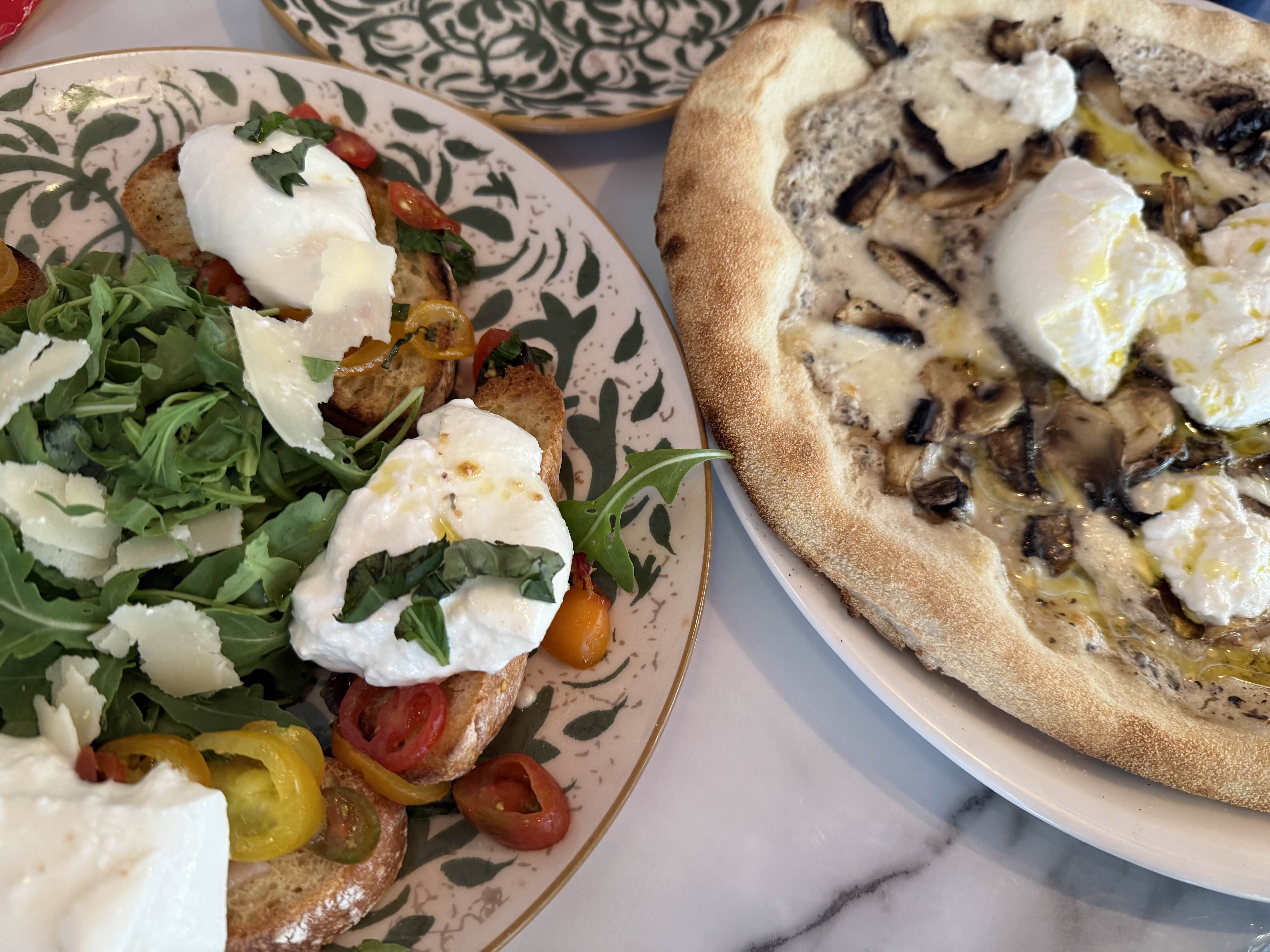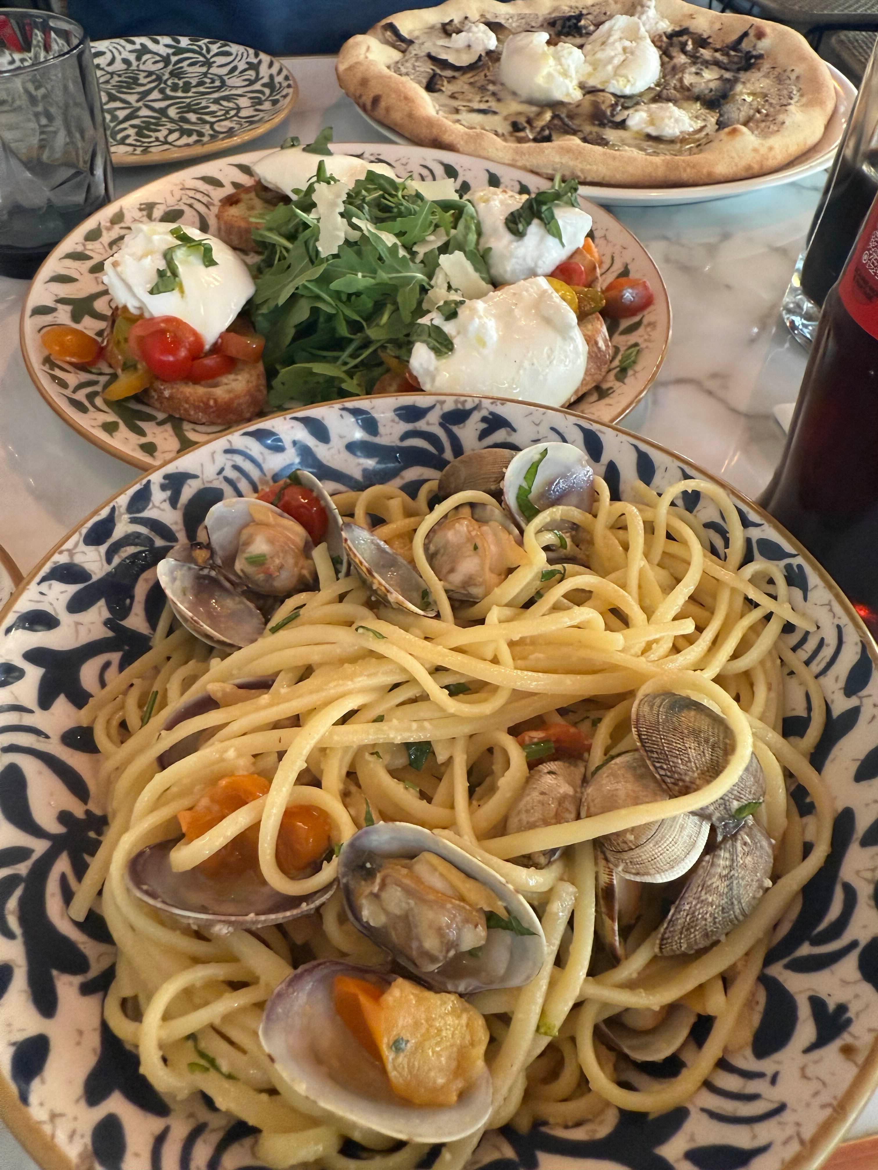 애피타이저로 부르스케타, 와플이 아부지는 피자, 저는 봉골레 스파게티를 주문했어요.