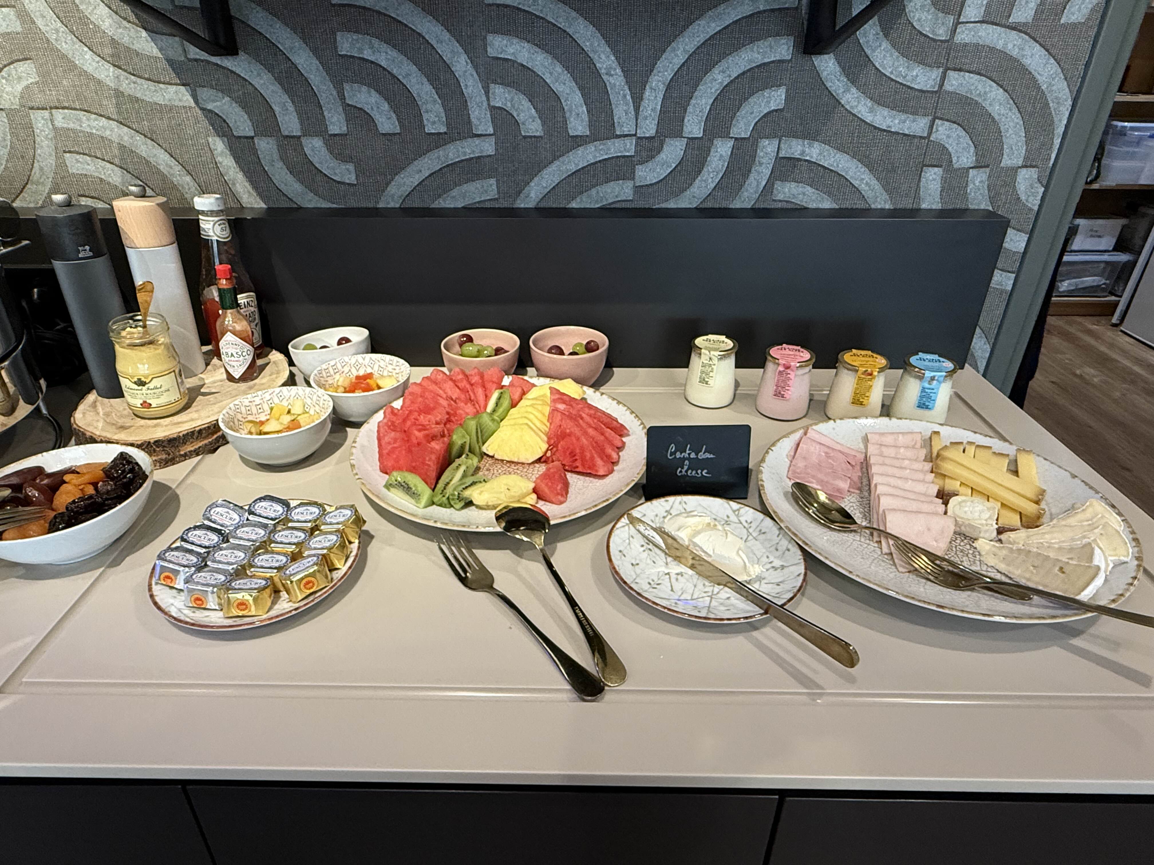 따뜻한 베이컨, 소시지는 물론이고, 햄과 다양한 치즈, 과일, 요거트등 조금씩 앙증맞게 가져다 놓았지만 프랑스 가정식으로 대접받는 느낌이었달까요?