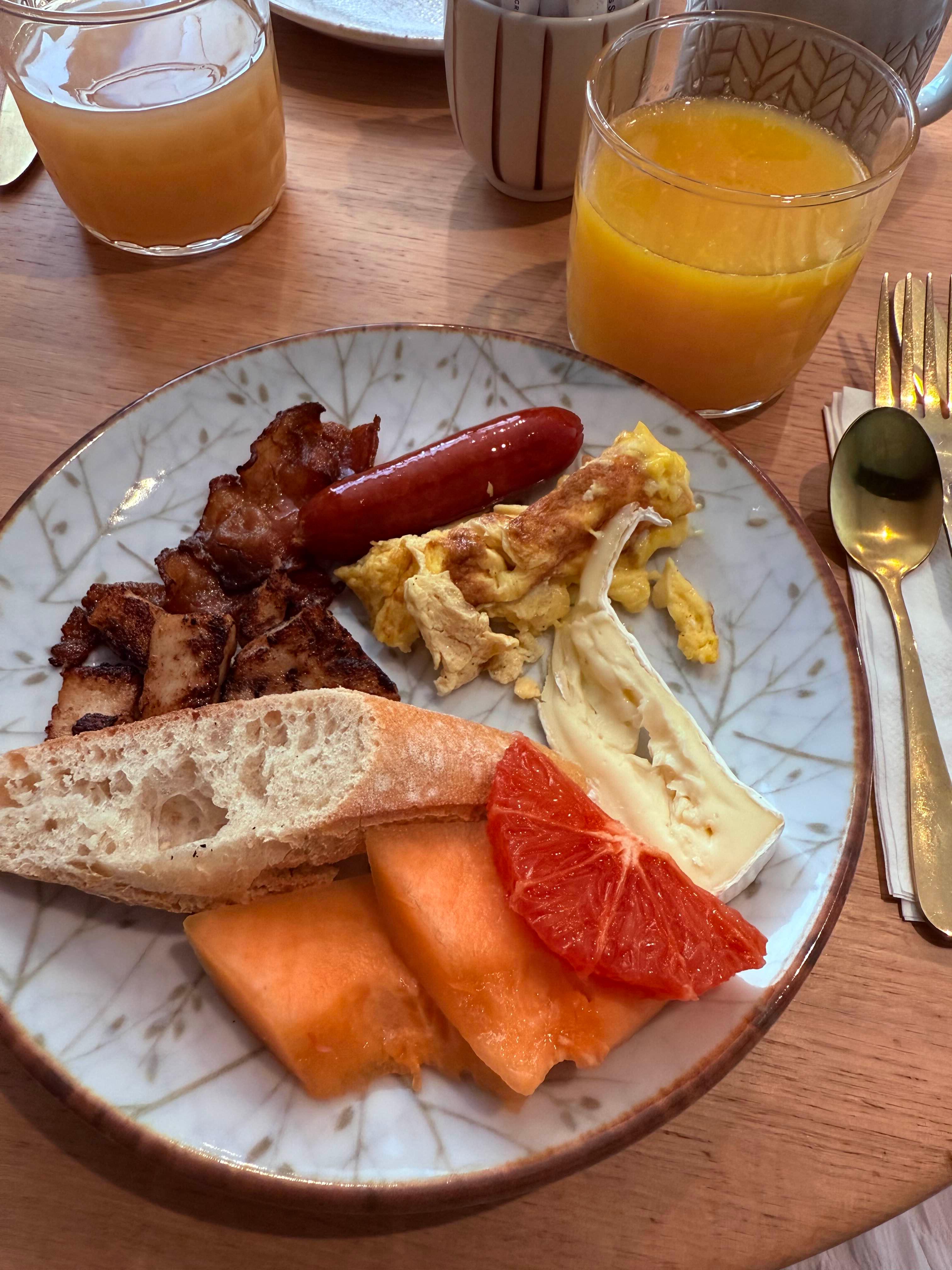 갓 짜낸 신선한 오렌지 주스와 애플 주스가 있는 조식을 먹으러 호텔 식당으로 갑니다.